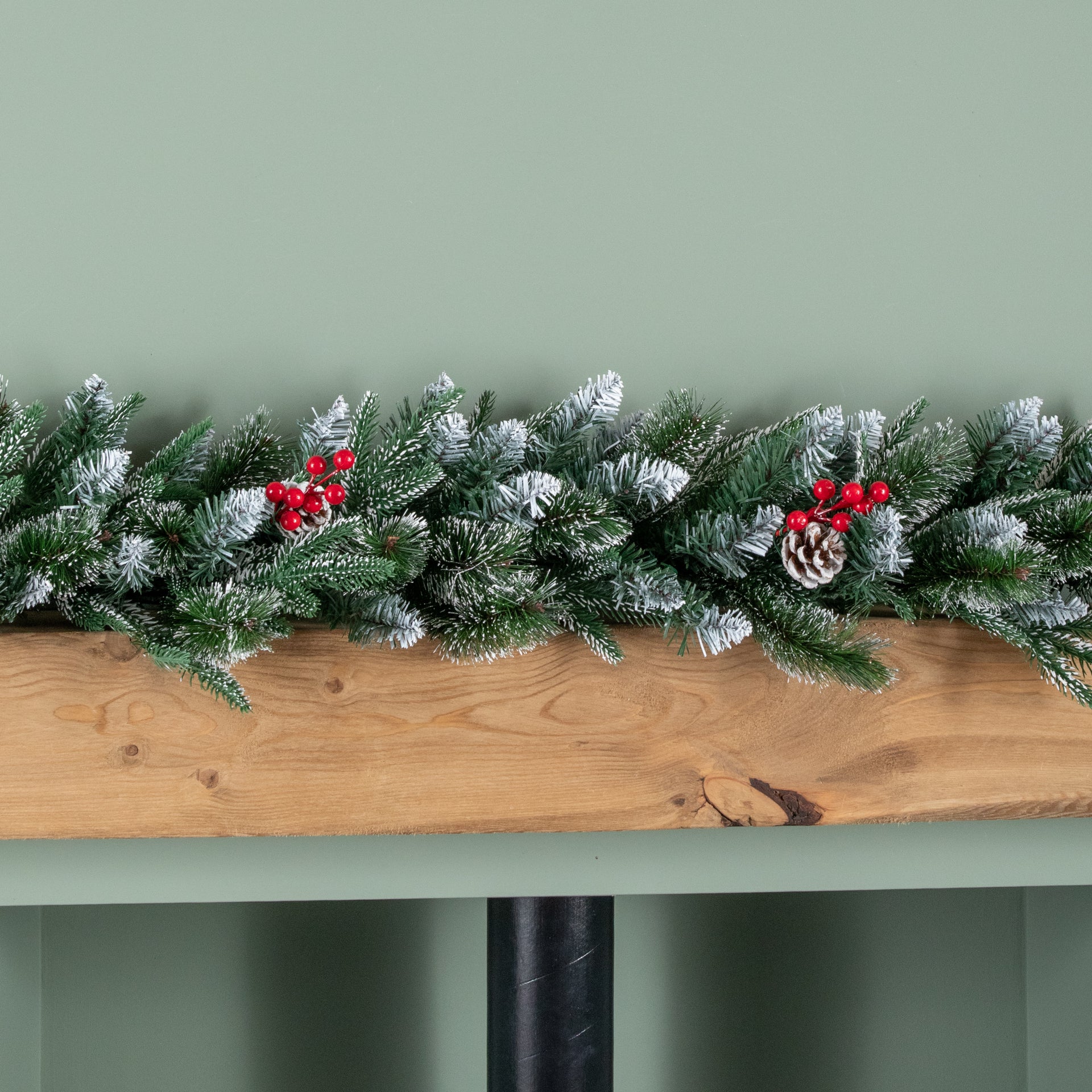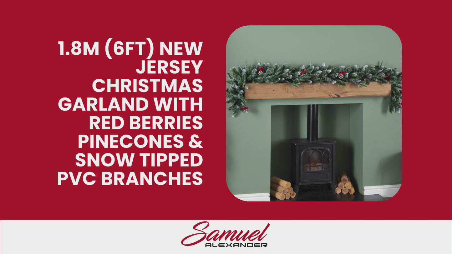 The New Jersey Christmas garland measures 180cm (6ft) in length, making it ideal for draping along mantelpieces, staircases, door frames, banisters or shelves. Crafted with snow-tipped PVC branches, it offers a full, realistic appearance. Decorated with vibrant red berries and natural style pinecones, this garland adds colour, texture and traditional Christmas charm to any setting. The rich green branches combined with snowy tips and festive accents create a warm, inviting display.