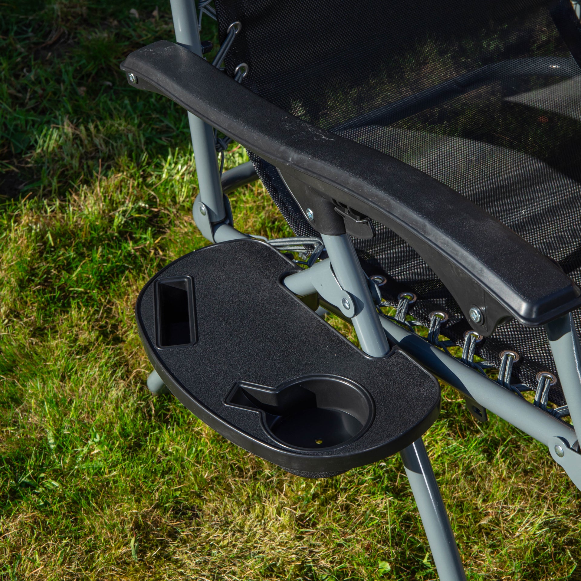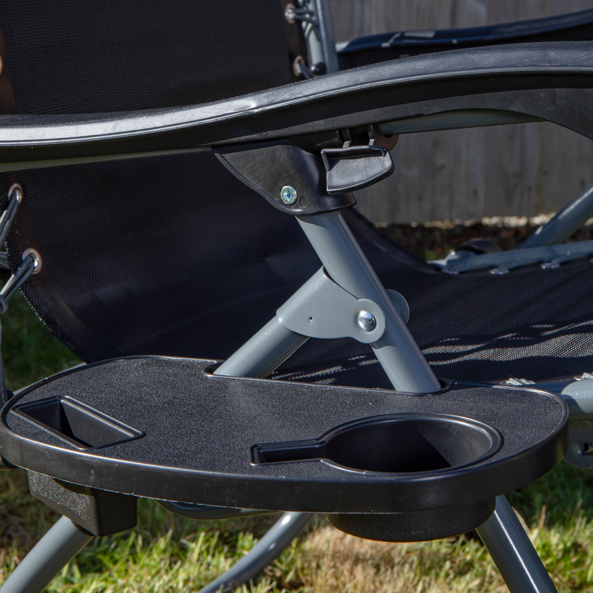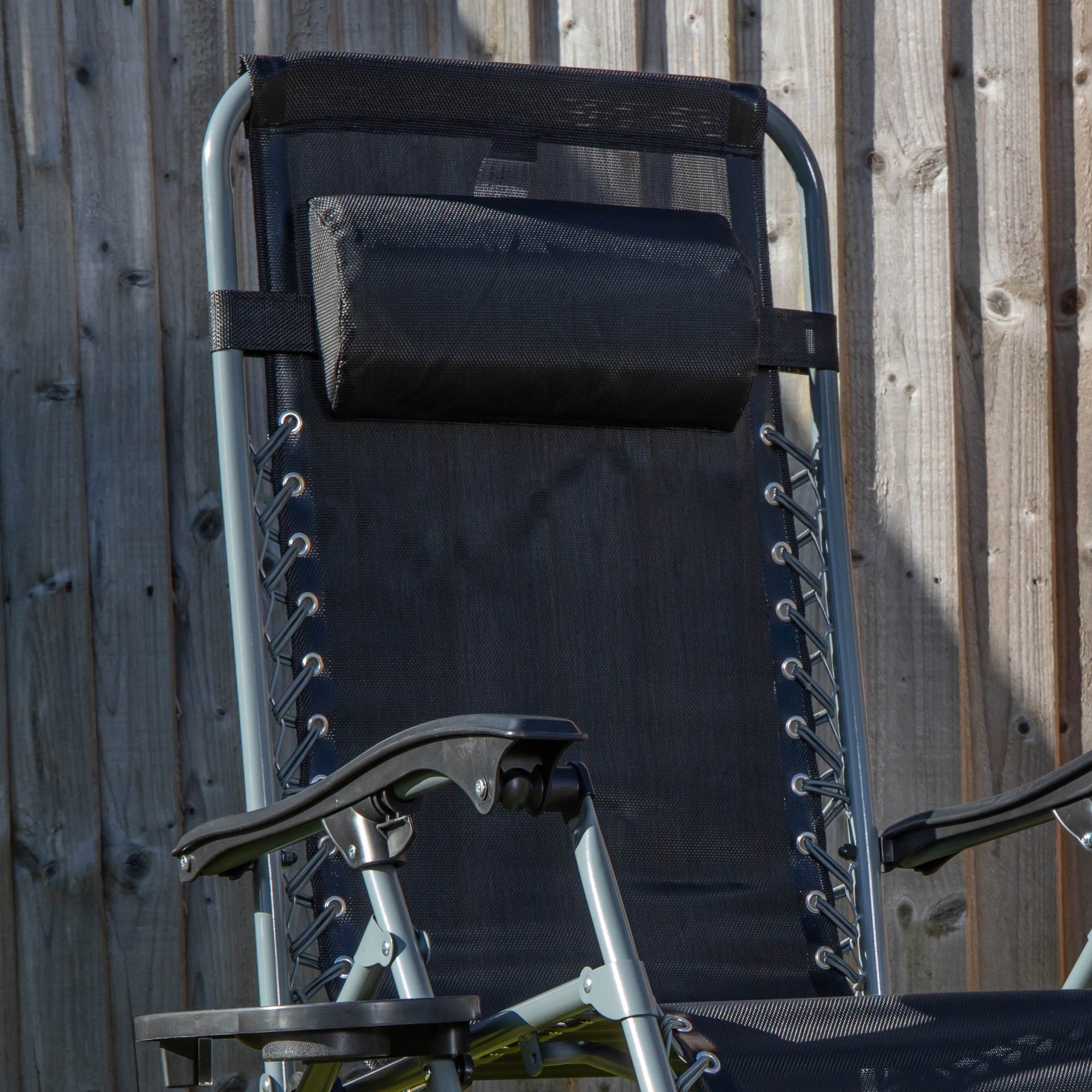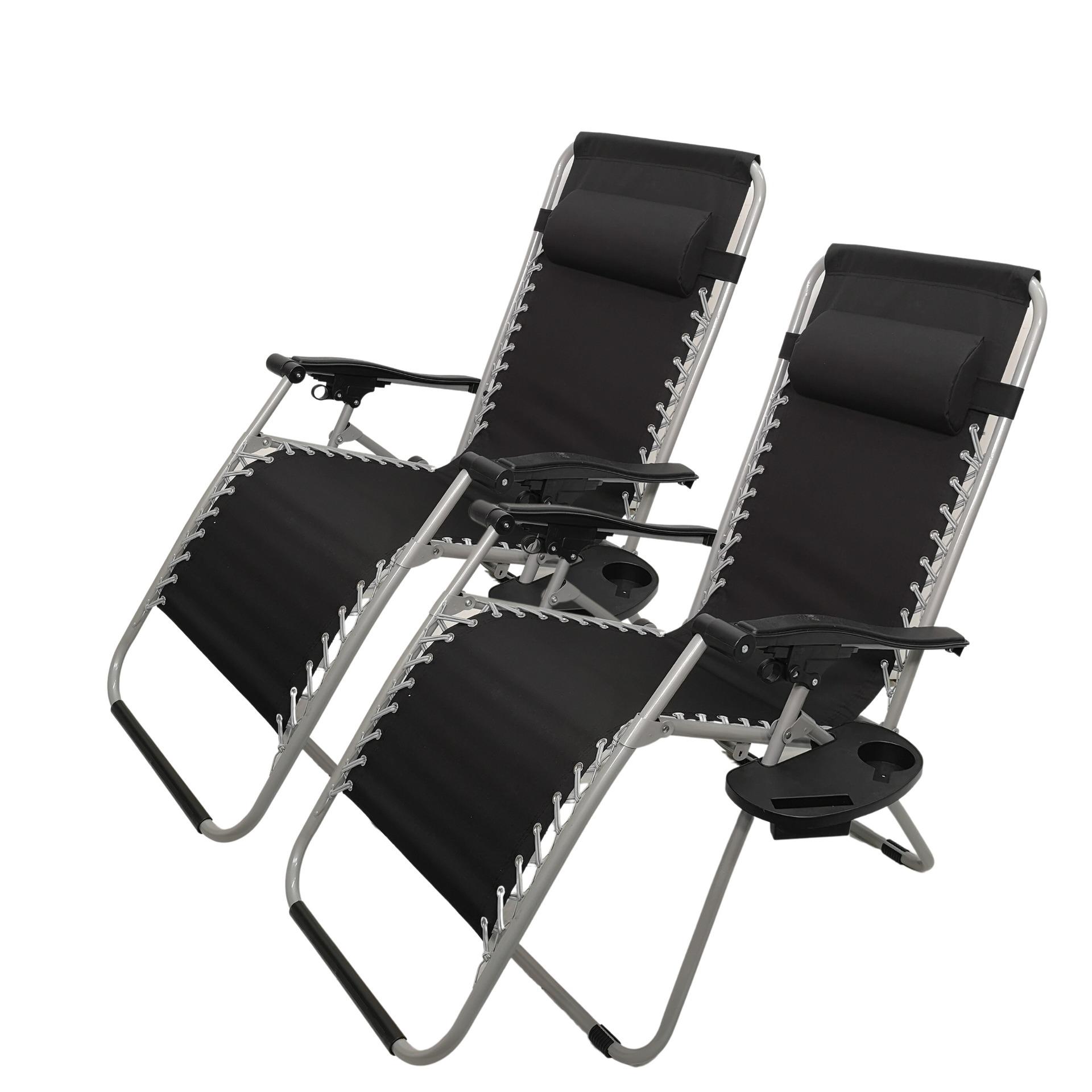 Made from high quality Oxford cloth, a fabric known for its durability and breathability with a metal frame in a stylish black and silver design, the multi-position chair blends seamlessly into any outdoor or indoor space, offering both function and aesthetic appeal. For added convenience, this set of chairs comes with a removable cup holder to hold your beverages, keeping them within easy reach while you relax. The pillow at the headrest provides additional comfort and support for your neck and head for a relaxing experience.